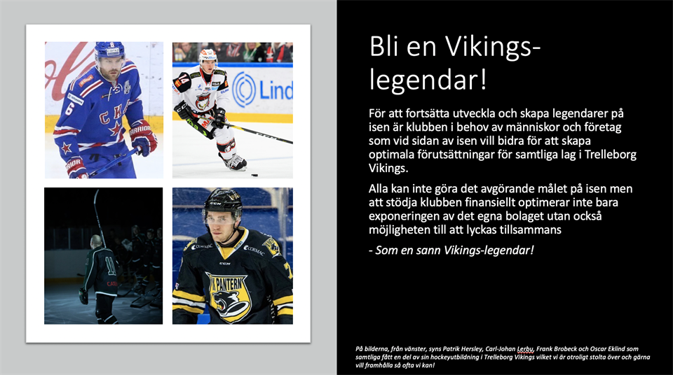 Vi kan nu stolt delge att vi numera har en kortare presentation om vår fina förening som bl.a. innehåller: - En enklare verksamhetsberättelse. - Information om ungdoms- och juniorverksamheten. - Information om seniorverksamheten. - Vikings-legendar, dvs. våra Partner- och sponsorpaket. - Årskortsalternativen. Syftet med presentationen är att ha ett centralt underlag som kortfattat förklarar vår verksamhet och erbjudanden som kan användas i möte med olika intressenter, företag etc. Vi har också klippt ut några av bilderna och skapat en separat "Årskorts-presentation". Självklart uppskattar vi som förening om vi alla kan hjälpas åt att finna partners som har ambitionen att bli en Vikings-legendar utanför isen samt fans, föräldrar och övriga privatpersoner som gärna vill investera i ett årskort inför kommande säsong. Underlagen är levande dokument som kommer att förändras i takt med att verksamheten utvecklas, feedback kommer in osv. Dokumenten/Underlagen finner på vår förstasida --> Mer --> Dokument --> "Förenings-PPP & Årskort". Vi tar tacksamt emot feedback, tankar och inspel som kan göra oss bättre tillsammans. I så fall är ni hjärtligt välkomna att kontakta någon av oss nedan: Daniel Bergström Fredrik Jönsson Ewa Forsberg Philip Persson Fredrik Troberg Må bäst! Vilja - Våga - Hjärta TILLSAMMANS! :)